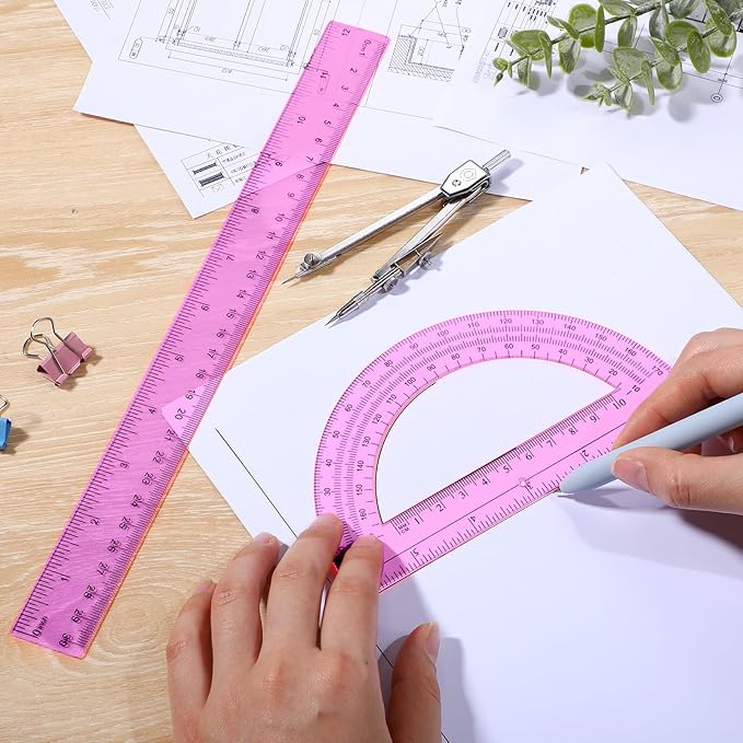 Zonon 3 Pcs Plastic Ruler 6 Inch Protractor Drawing Compass Set, Student Geometry Math Transparent Measuring Tools for Home School Classroom Office Supplies(12 Inch,Pink)
