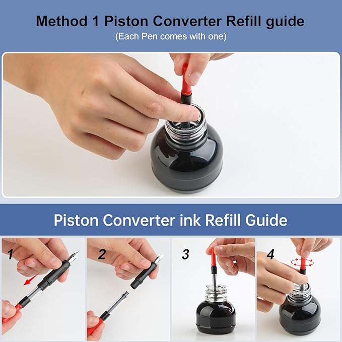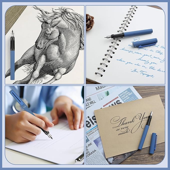- 【8 Colorful Calligraphy Fountain Pens】 The 8 fountain pens were includes the piston converters. You can extract your preferred ink with the piston converters. The 8 color shades of fountain pens barrels are created for varied occasions and moods. The taupe grey and deep blue fountain pen can be used in formal office workings. The lake green and icy blue fountain pen can be used in daily personal use or calligraphy practice. The playful yellow and mint green pen offers enjoyable coloring and fun artistic creation. Differed colors for your varied mood