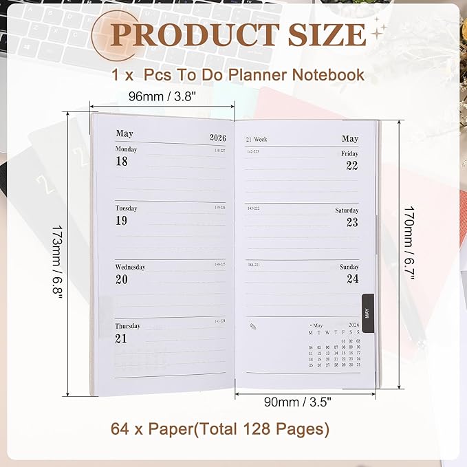 - Specification: Color: Star Black; Material: PU Leather, Paper; Cover Size: 173 x 96 mm/6.8 x 3.8 inch(LxW); Inner Page Size: 170 x 90 mm/6.7 x 3.5 inch(LxW); Number of Inner Pages: 64 Pages; Inner Page Weight: 70 GSM; Packing List: 1 x 2026 Daily Planner Notebooks