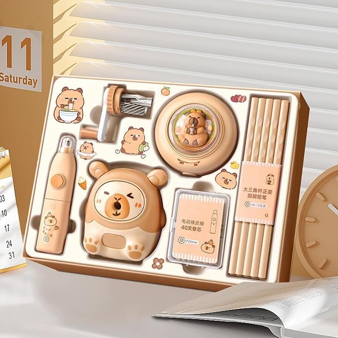 Capybara Stationery Set, Kids Stationery Kit, Colorful School Supplies for Students, Electric Eraser Pencils, Animal Pencil Sharpener, Homeschool Classroom for Elementary and Middle School